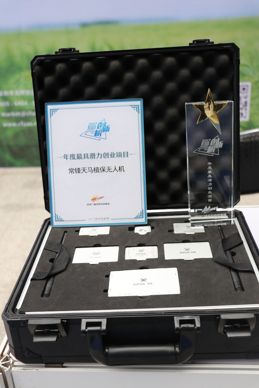 深圳常鋒信息技術有限公司的全自主研發的全球首款油動直驅多旋翼無人機——常鋒天馬植保無人機憑借大載重、長航時、高精準導航、仿地形、全自主飛行、完善的操作軟件和調度軟件等優勢以及平臺化的系統解決方案斬獲2017深圳創新榜年度最具潛力項目。