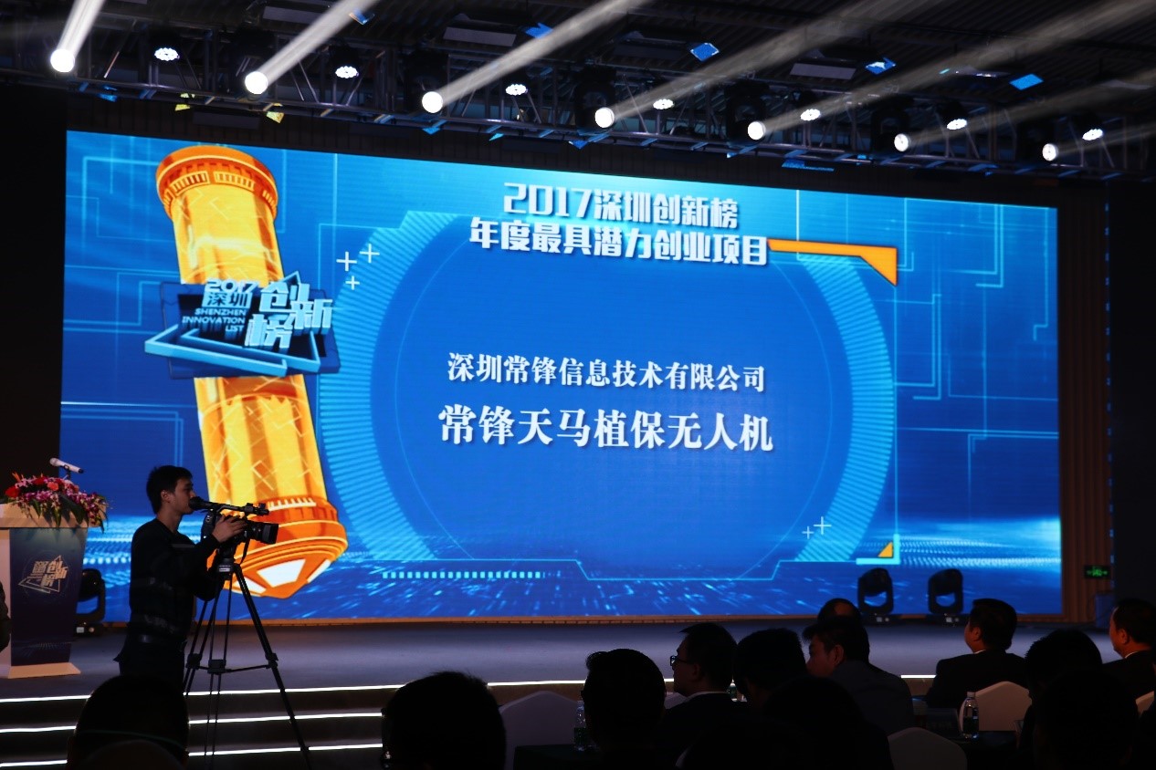 作為享譽全球的“創客之城”,深圳孕育出了大量知名獨角獸企業。11月20日,由深圳廣電集團主辦的“2017深圳創新榜榜單發布盛典暨創新深圳論壇”上,一批新興企業和行業大咖經過層層選拔榮譽入榜,其中常鋒無人機的常鋒天馬植保無人機榮獲年度最具潛力創業項目。